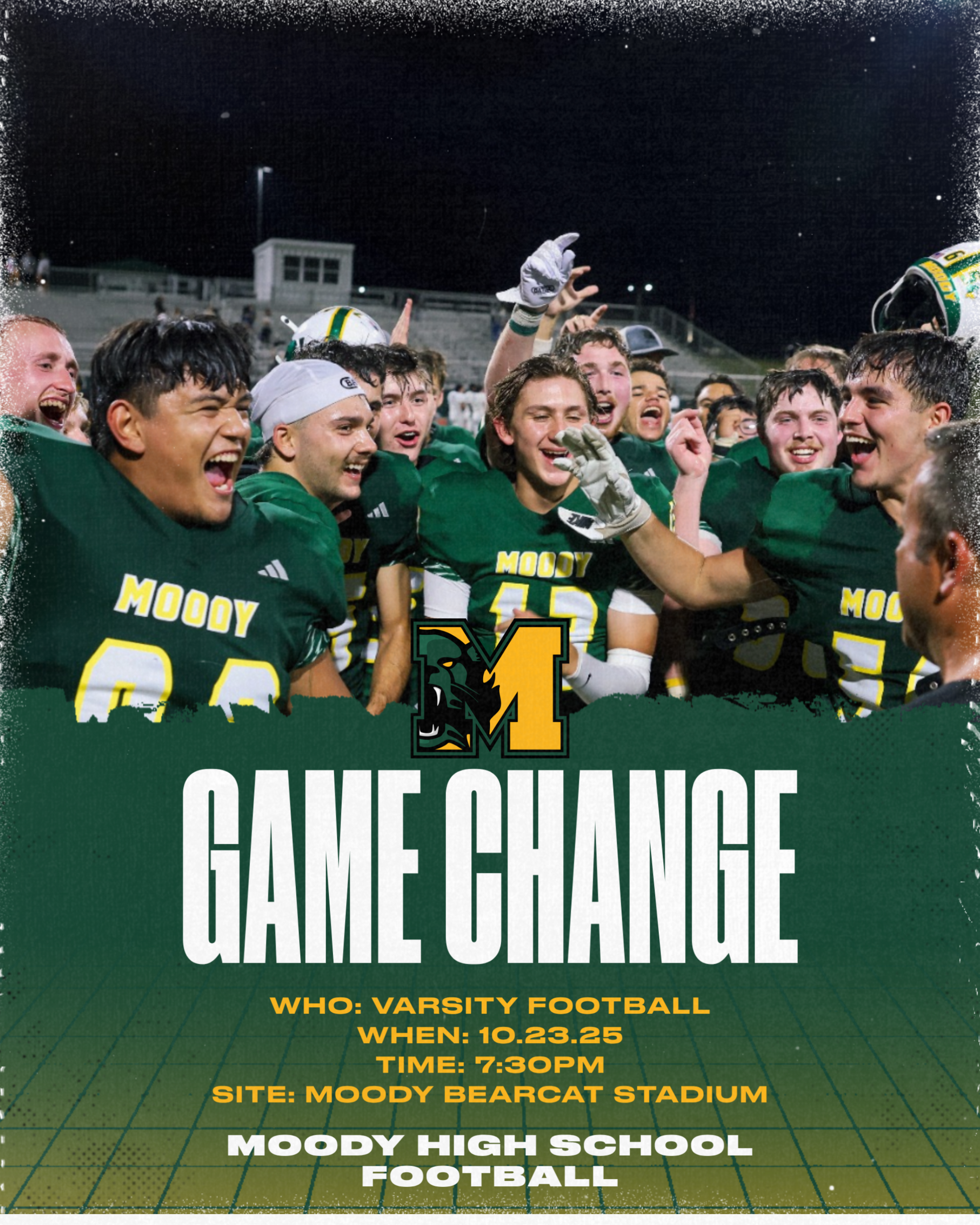 Football games and activities are being rescheduled this week due to possible inclement weather predicted on Friday: Middle School is scheduled for Friday October 24th at 5:00 pm in Crawford. Our district pep rally will be at 2:15 pm on Thursday October 23rd. All Little Cat Cheer activities are moved to Thursday. Little Cats should arrive at 6:30 pm and report to the north end of the football field (scoreboard side). Please contact Moody High School if you have any questions. |